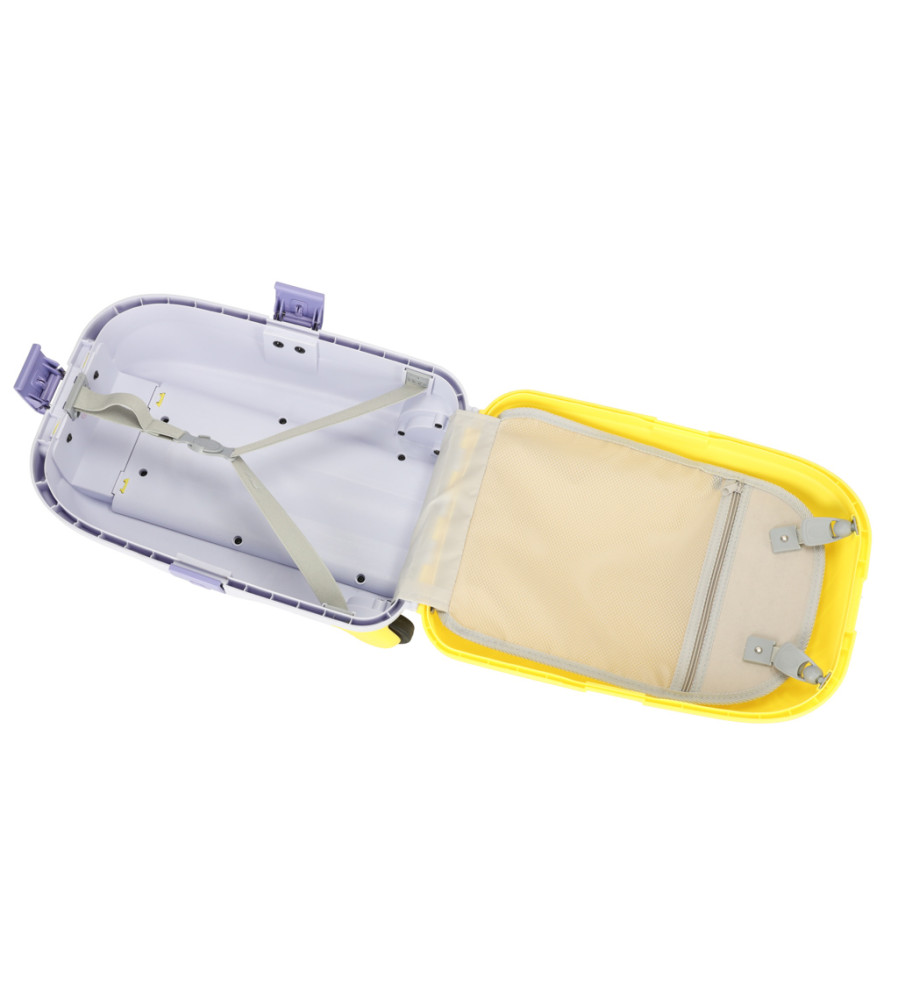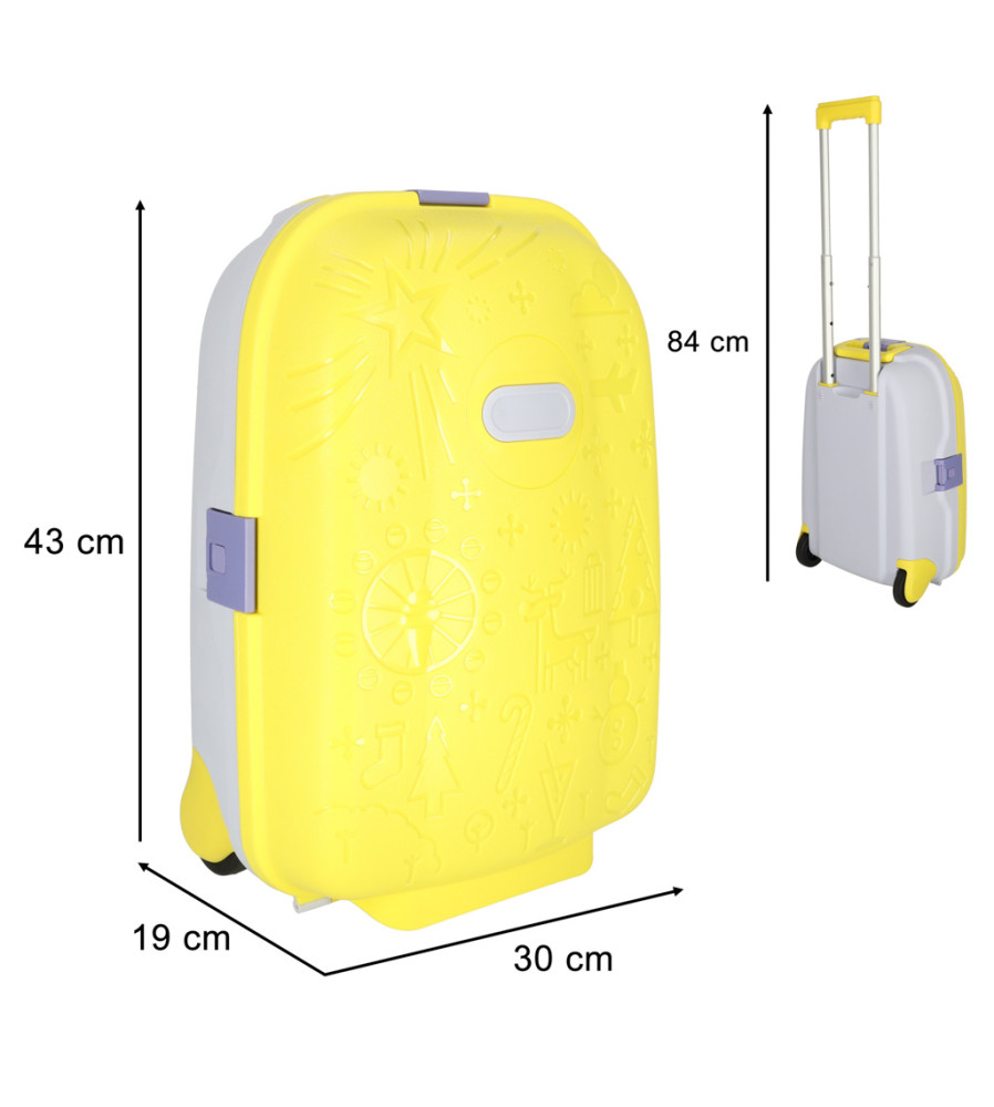 O valiză galbenă pentru copii este însoțitorul perfect pentru orice aventură! Prevazut cu maner extensibil, perfect adaptat la inaltimea copilului, pentru o utilizare confortabila. Închiderea sigură cu trei clape garantează că bagajele rămân în siguranță în timpul călătoriei. Interiorul valizei include un buzunar pentru obiecte mici și curele practice de compresie pentru a menține lucrurile la loc. Construcția ușoară a valizei înseamnă că chiar și cei mai tineri călători nu vor avea probleme în a o transporta. Are doua roti de cauciuc care nu fac zgomot.