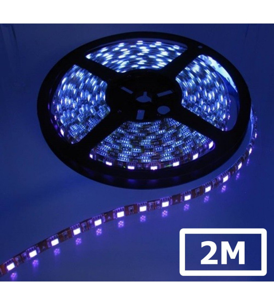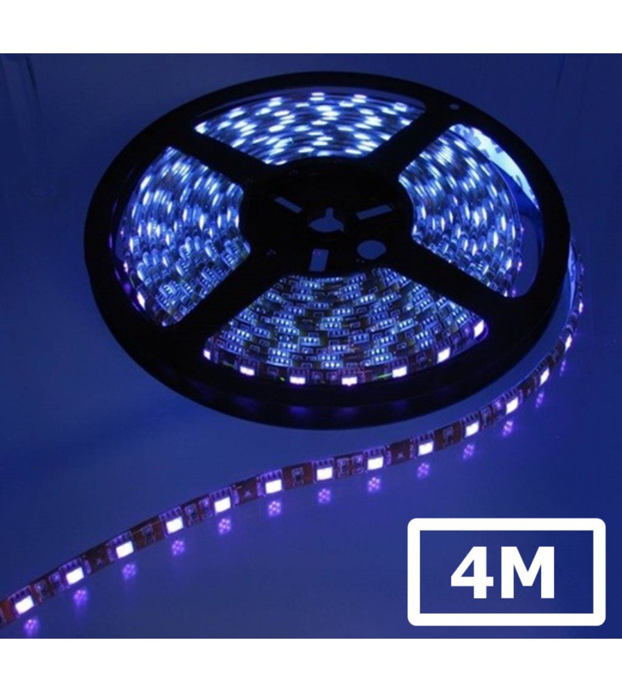 Bandă LED UV Ultraviolet 12V cu 60 LED/m, tehnologie SMD5050, protecție IP65 și PCB negru. Ideală pentru efecte speciale, decor, vitrine sau aplicații hobby.