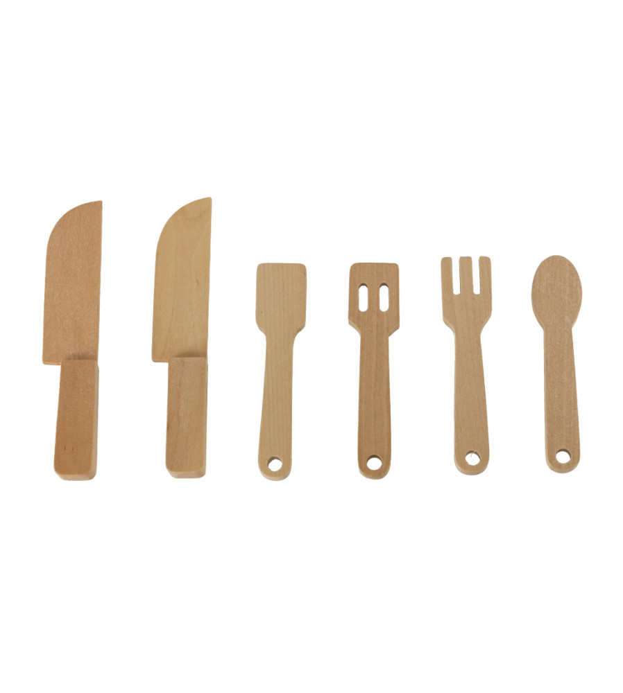 Bucătăria are diverse rafturi unde copilul tău poate depozita toate accesoriile de bucătărie - tacâmuri din lemn, o tigaie și condimente. Există un loc pentru orice!