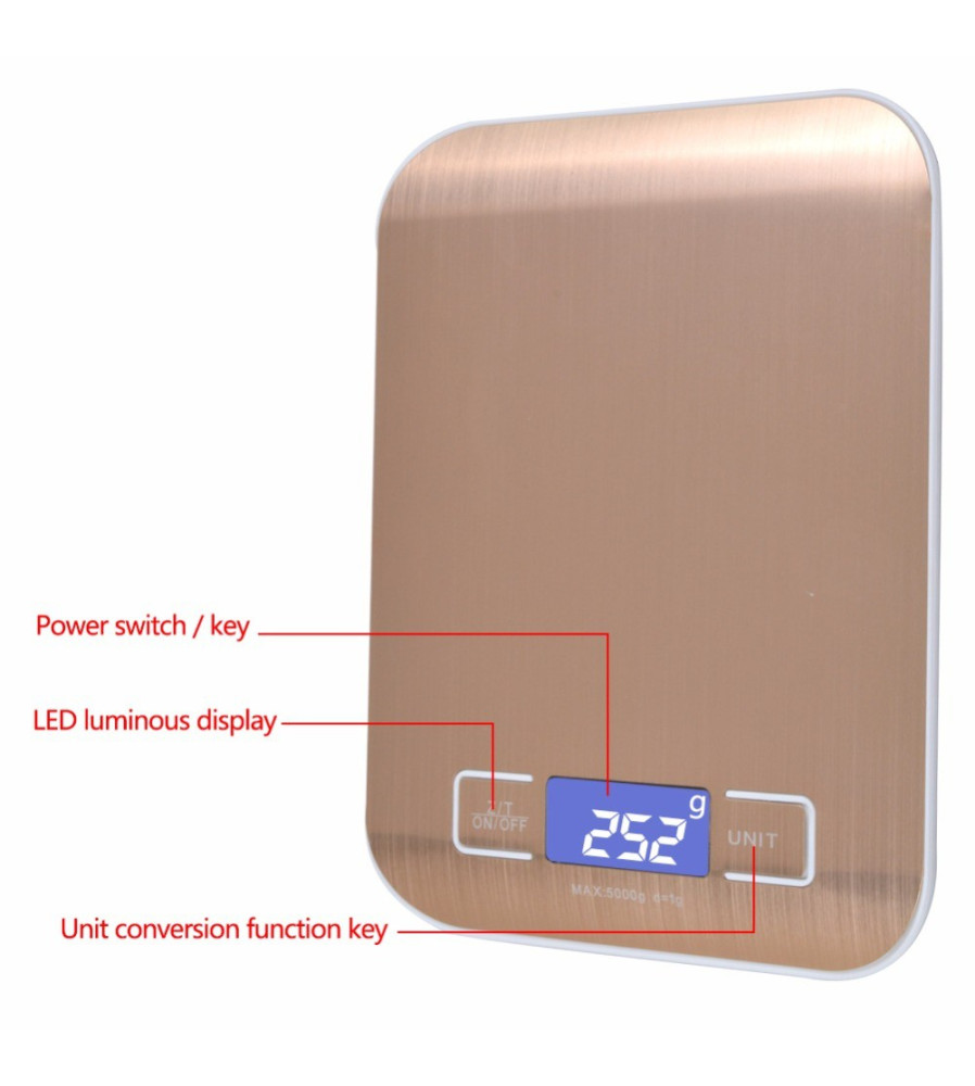 Cântar de bucătărie digitală foarte subțire cu suprafață de cântărire din oțel inoxidabil.