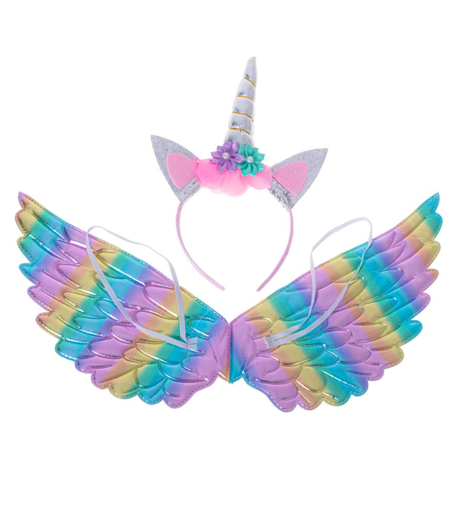 Set costum Unicorn curcubeu cu bentita, fusta si aripi3-6 ani 90/120