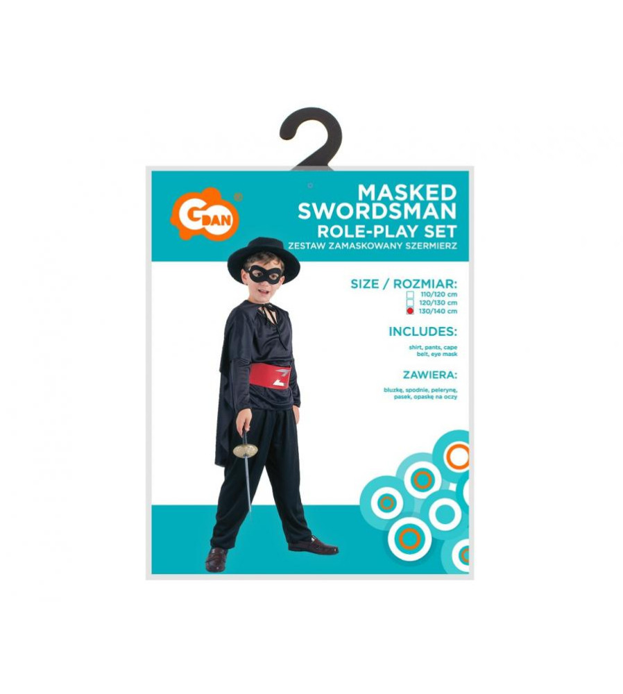 Costumul de spadasin mascat este o alegere excelentă pentru micii aventurieri care visează să devină eroii basmelor și filmelor lor preferate. Setul include o bluză elegantă neagră și pantaloni care vor asigura confort în orice mișcare, precum și o pelerină și accesorii caracteristice, inclusiv o curea și o legătură la ochi, care vor da întregului look o notă de mister și stil. Întregul ansamblu captivează prin combinația sa de culori negru și roșu, ceea ce îl face să iasă în evidență față de alte costume.